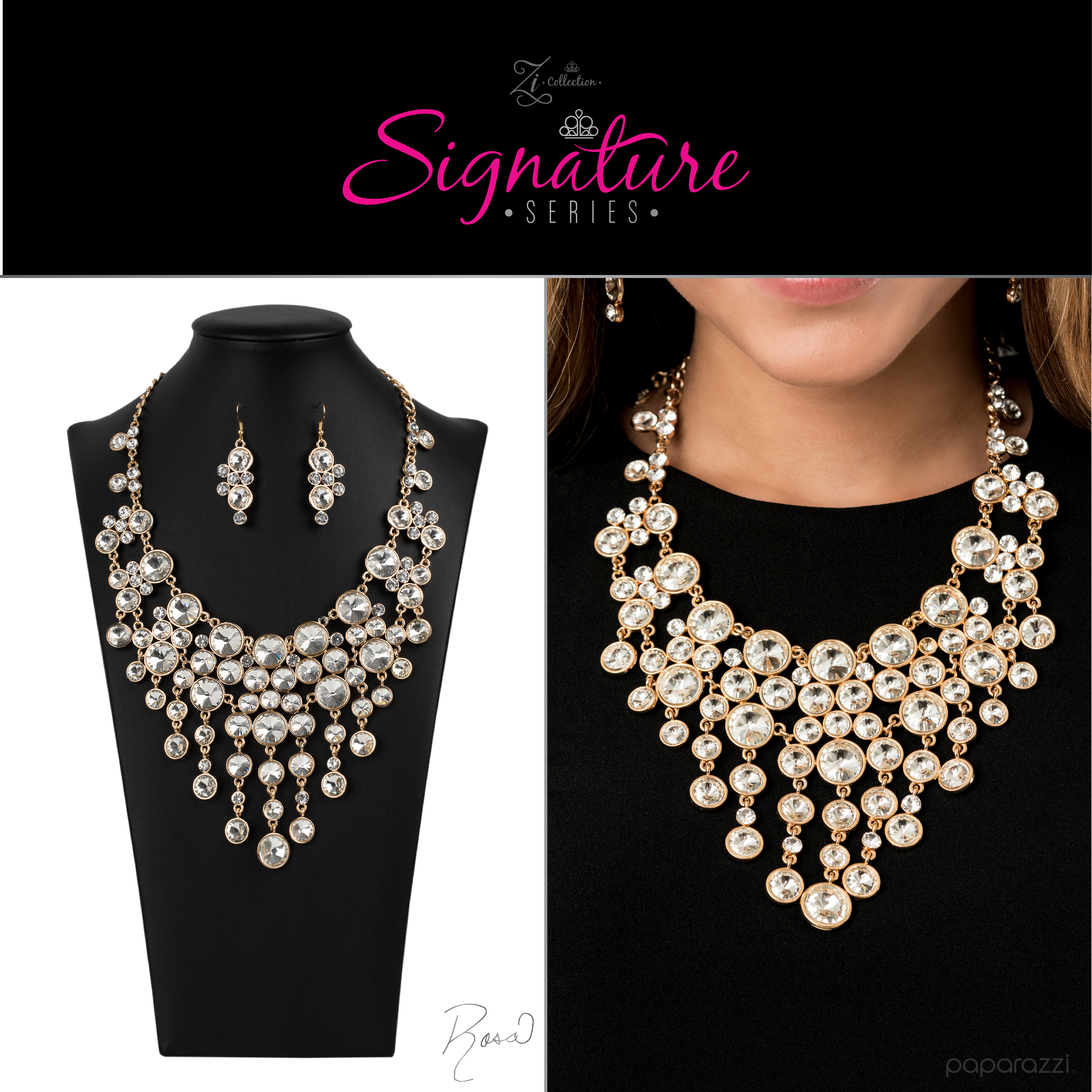 A sparkling storm of classically clustered white rhinestone frames elegantly scatter below the collar. Encased in sleek gold fittings, varied sizes of glassy white rhinestones drip from the bottom of the delicately linked gold frames, resulting in a head-turning twinkle that demands a double take. Features an adjustable clasp closure.