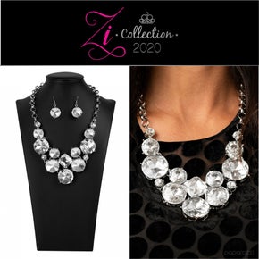 Varying in size and shape, a dramatic collision of oversized white rhinestones connect into an unapologetically glamorous statement piece below the collar. Attached to chunky silver links, the breathtaking display of clustered gems radiates confidence. Features an adjustable clasp closure.